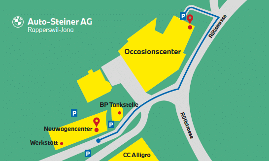 Und wie Sie auf dem Plan ersehen, liegt bei uns alles kompakt beisammen – die Occasionen, die Neuwagen und die Werkstatt.